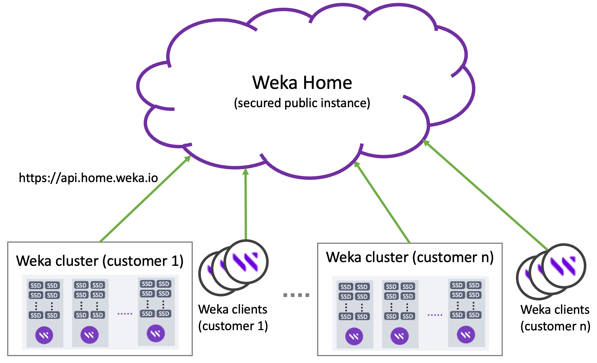 <figure><img src="https://661826007-files.gitbook.io/~/files/v0/b/gitbook-x-prod.appspot.com/o/spaces%2FuOB5D2WMRjXBnChPFTrk%2Fuploads%2Fgl2Z2W5whQq1rPmEPp03%2Fwekahome_overview.png?alt=media&#x26;token=d3c30a8c-fc23-4c95-b46a-9c5532fef20c" alt=""><figcaption><p>Weka clusters and clients connected to Weka Home</p></figcaption></figure>