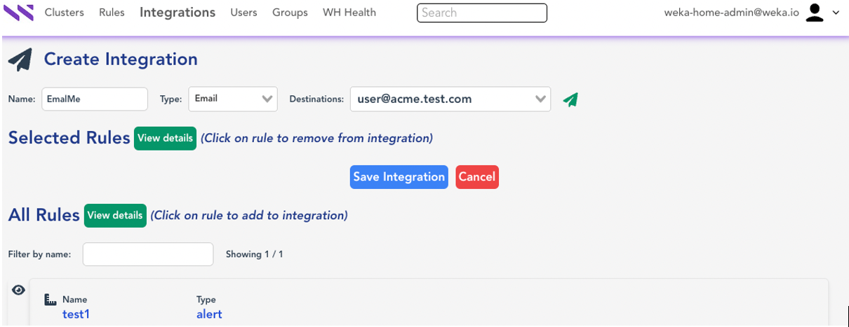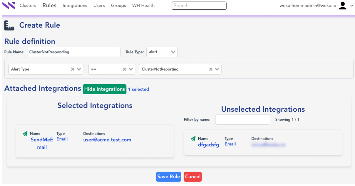 The Create Rule page allows you to create custom rules for specific alerts or events that trigger predefined integrations. Multiple event types and alert types are supported. For example, you might want to create an alert that is raised when the cluster is not responding, and you want it emailed to a specific address.
