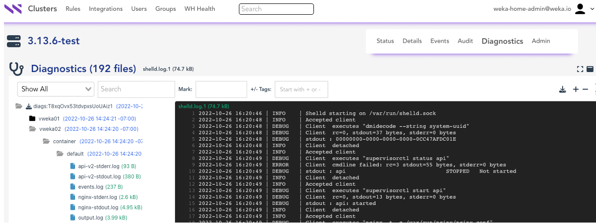 The Diagnostics page displays all the collected event logs, syslog files, trace files, container information, and more. The Customer Support Team uses this information for deeper case analysis.