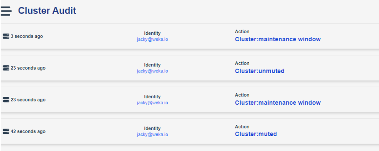 The **Cluster Audit** page lists all audited activities such as *mute/unmute clusters* and *set maintenance window*.