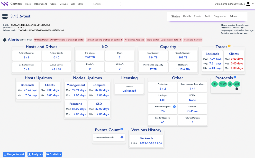<figure><img src="https://1916840177-files.gitbook.io/~/files/v0/b/gitbook-x-prod.appspot.com/o/spaces%2FTUYL9RLgSDAkF2U90csR%2Fuploads%2FenSEPrkrgw3MLTQVSgBr%2Flwh_cluster_stats2.png?alt=media&#x26;token=0498695b-aacf-4faa-b279-e17d7a404d0e" alt=""><figcaption><p>Weka Home Health Dashboard</p></figcaption></figure>