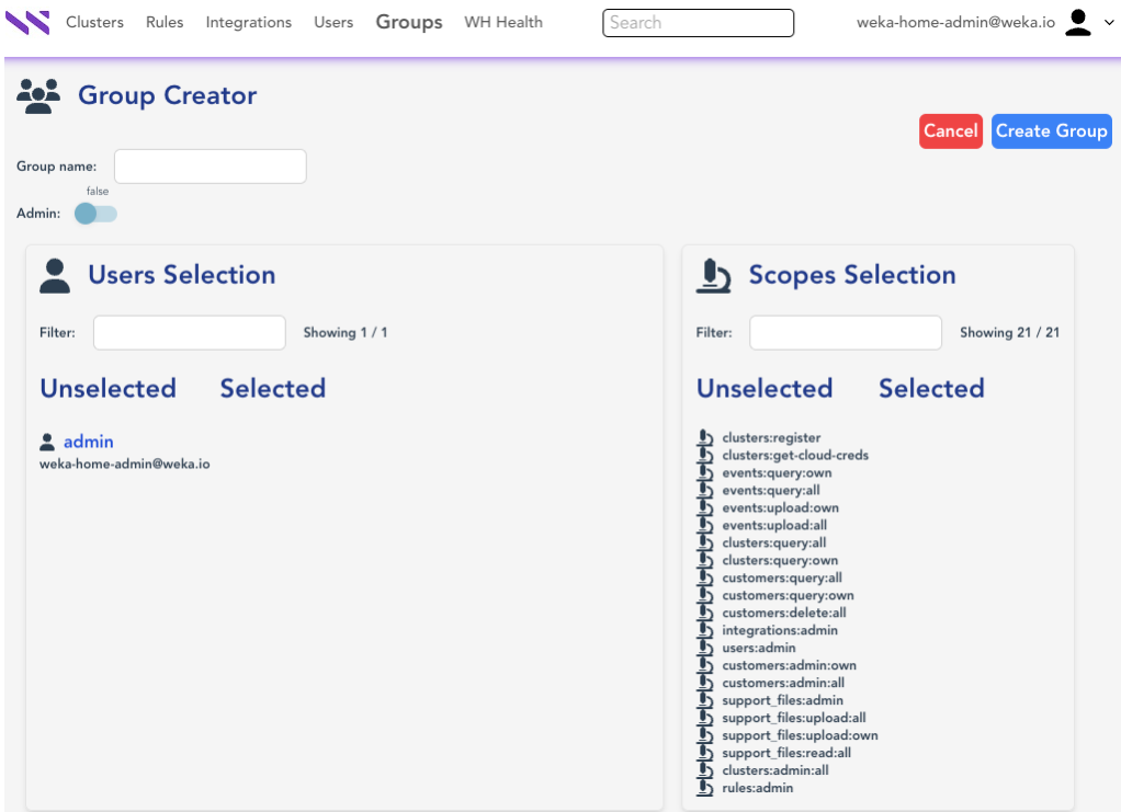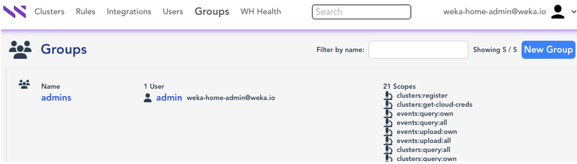 The Groups page displays all the groups, their respective members, and scopes (roles) each group is allowed to access or view in Local Weka Home.