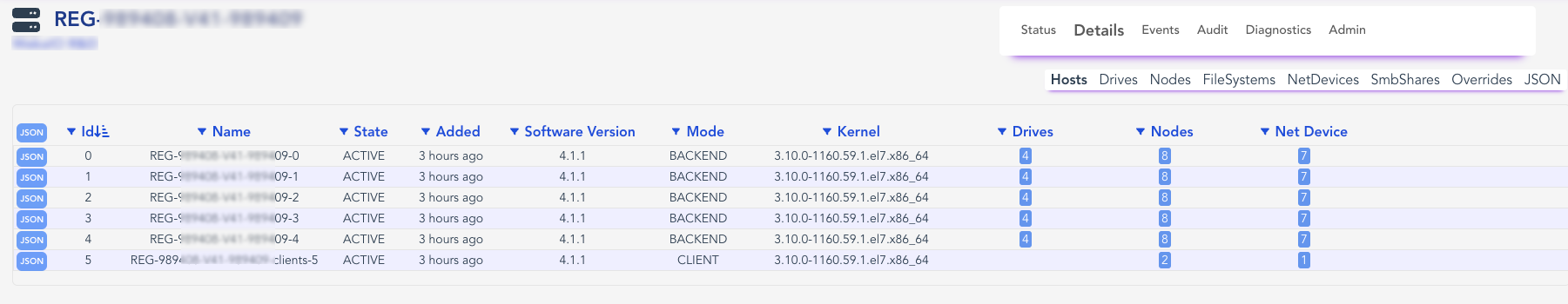 The Details page displays the Hosts (containers), Drives, Nodes (processes), Filesystems, Net Devices, SmbShares, Overrides, and the cluster configuration in a JSON format.