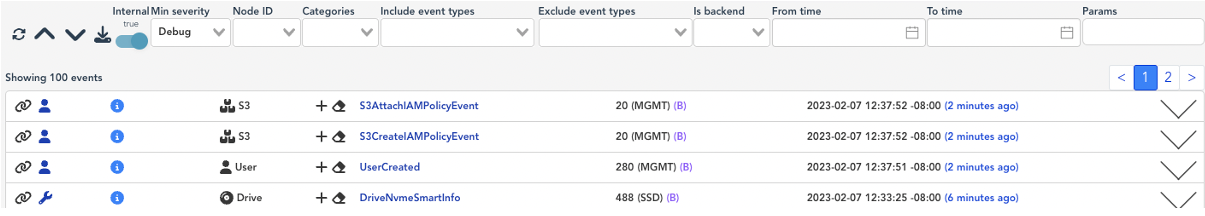 The Events page displays the offline event data for the cluster and associated detail with each event. You can filter the events based on severity, narrow them down to specific node IDs in the cluster, and more.