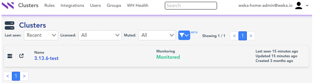 Local Weka Home monitors and reports on multiple clusters within your organization. The first screen upon entering LWH displays all the Weka clusters in your environment that are enabled to send telemetry data to your local Weka Home instance.