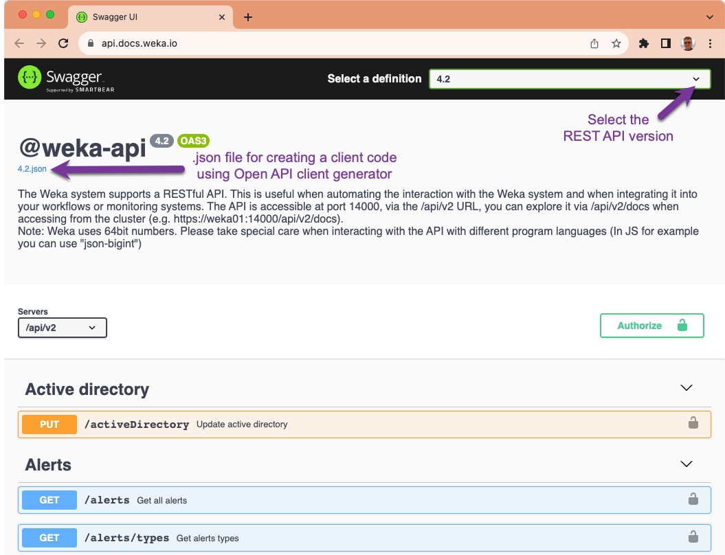 Browse to api.docs.weka.io and select the REST API version from the definition selector.