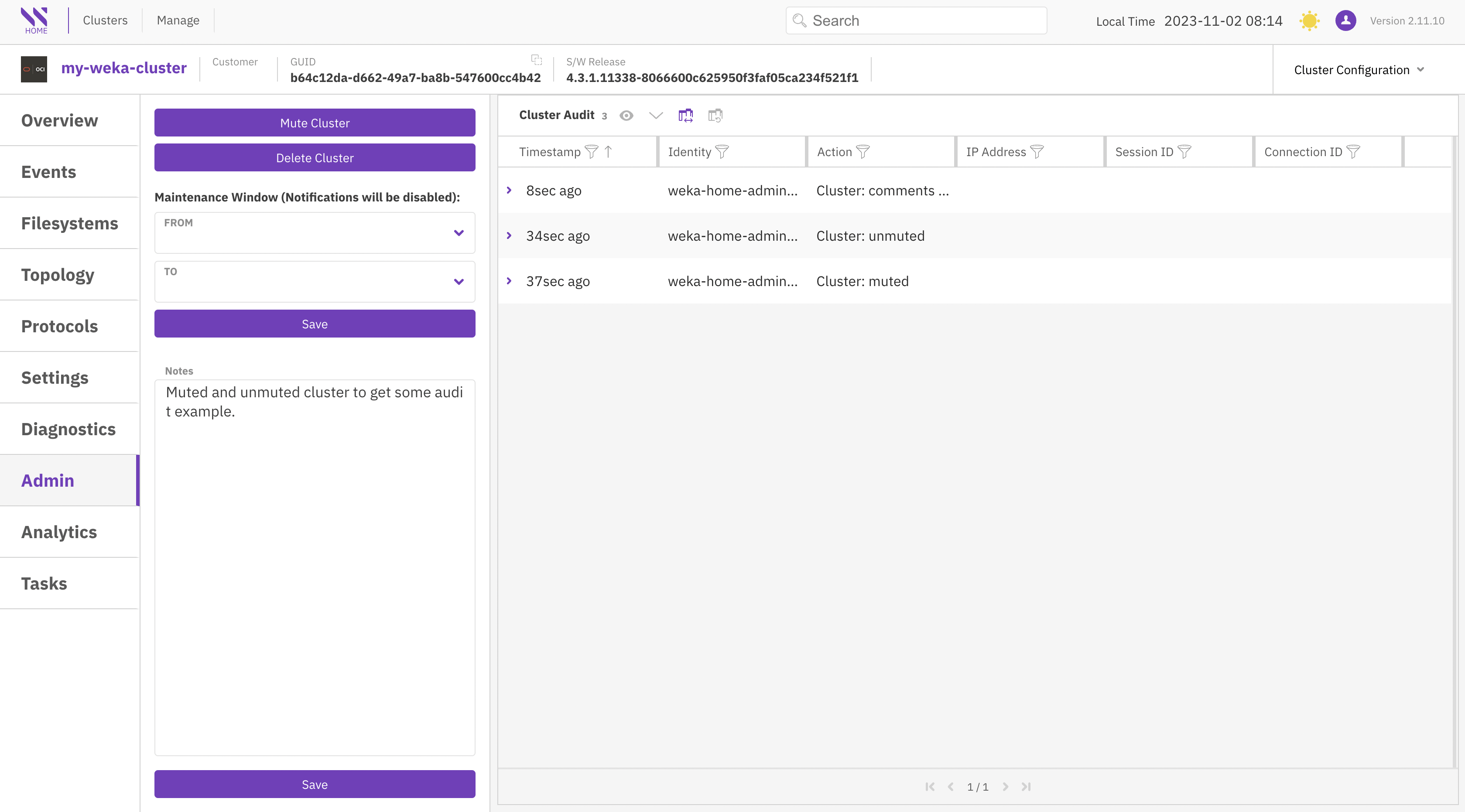 Mute Cluster: Temporarily prevent the cluster from sending alerts or events to Local WEKA Home. Useful for mitigating alert overload during maintenance activities.