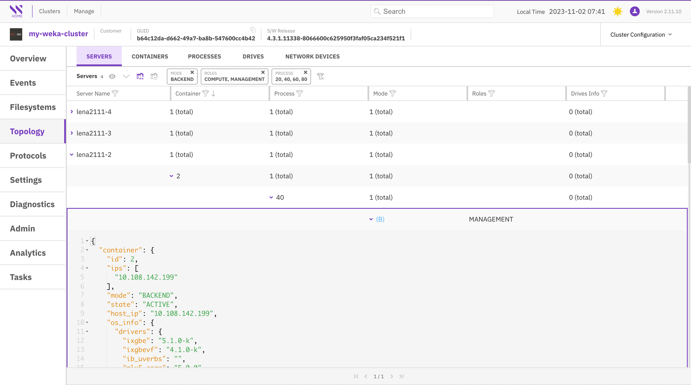 The Analytics page displays the cluster configuration (similar to the Topology view) in JSON format. To locate specific information, use the search feature and its options. If you need to copy the content, click the copy icon located next to the first row.