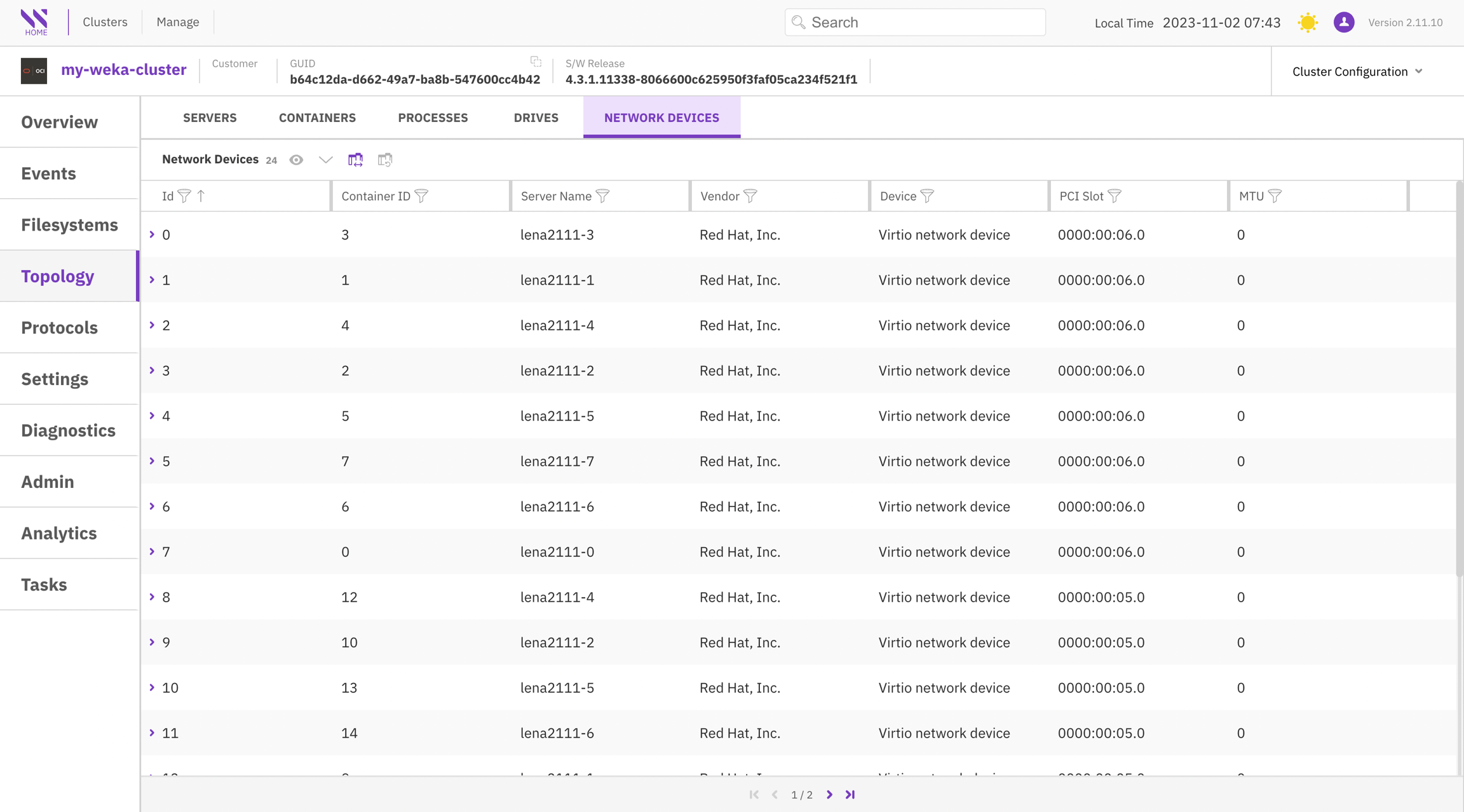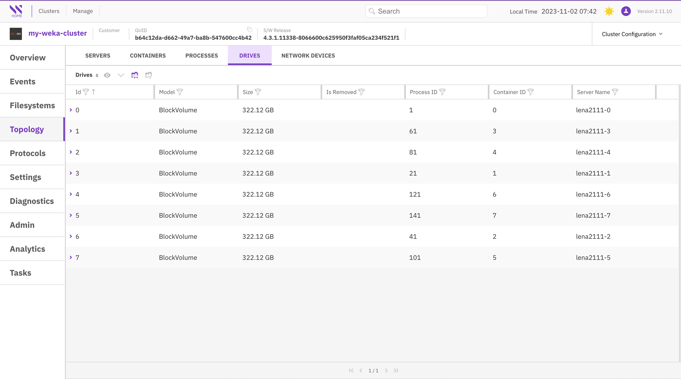 The Topology page presents an array of cluster configurations categorized into sections: Servers, Containers, Processes, Drives, and Network Devices.