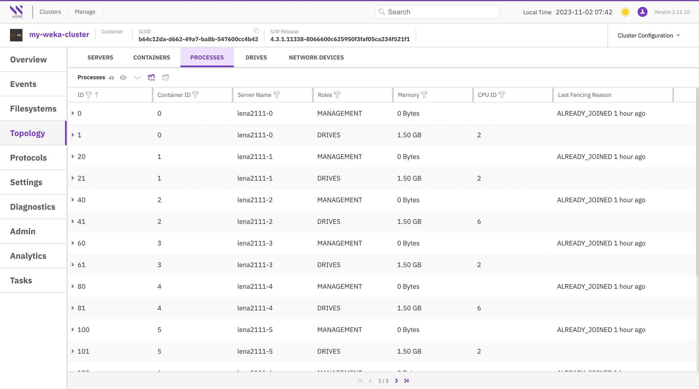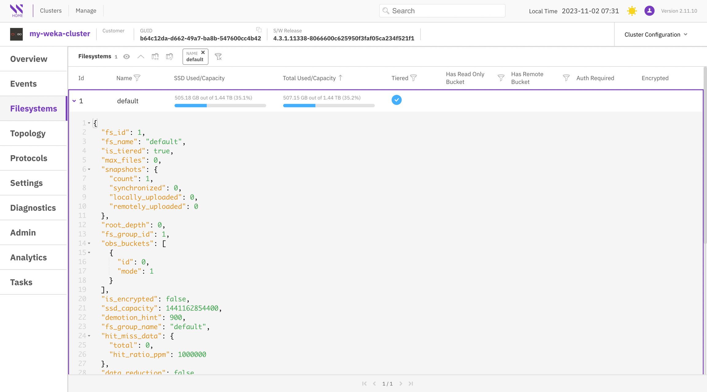 The Filesystems page provides comprehensive information about the configured filesystems in the cluster.