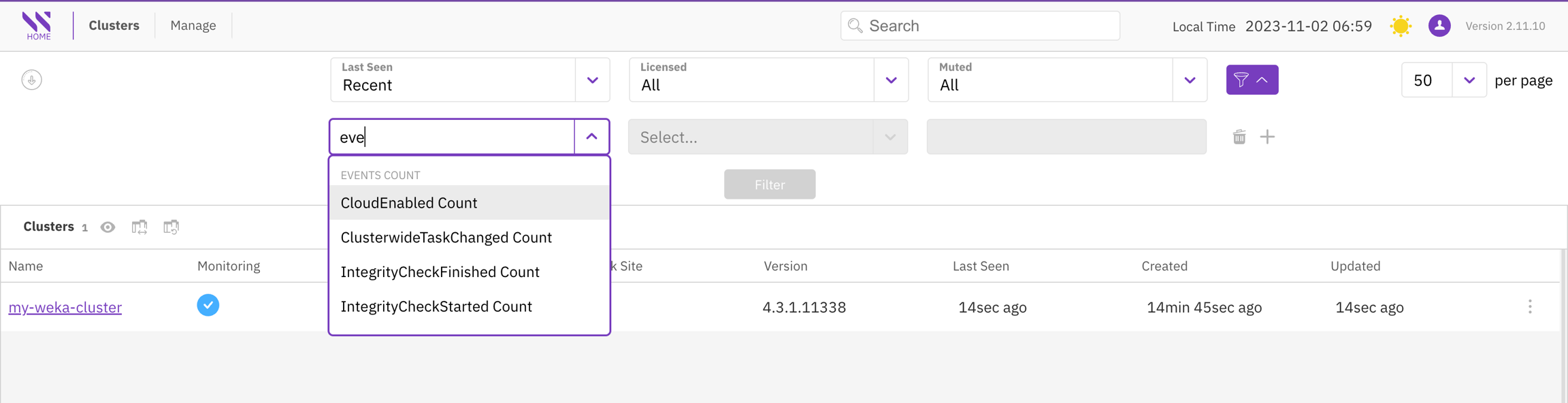 You can filter and sort the clusters based on a range of criteria, including their last seen status, licensed or unlicensed status, and whether the clusters have silenced alerts.