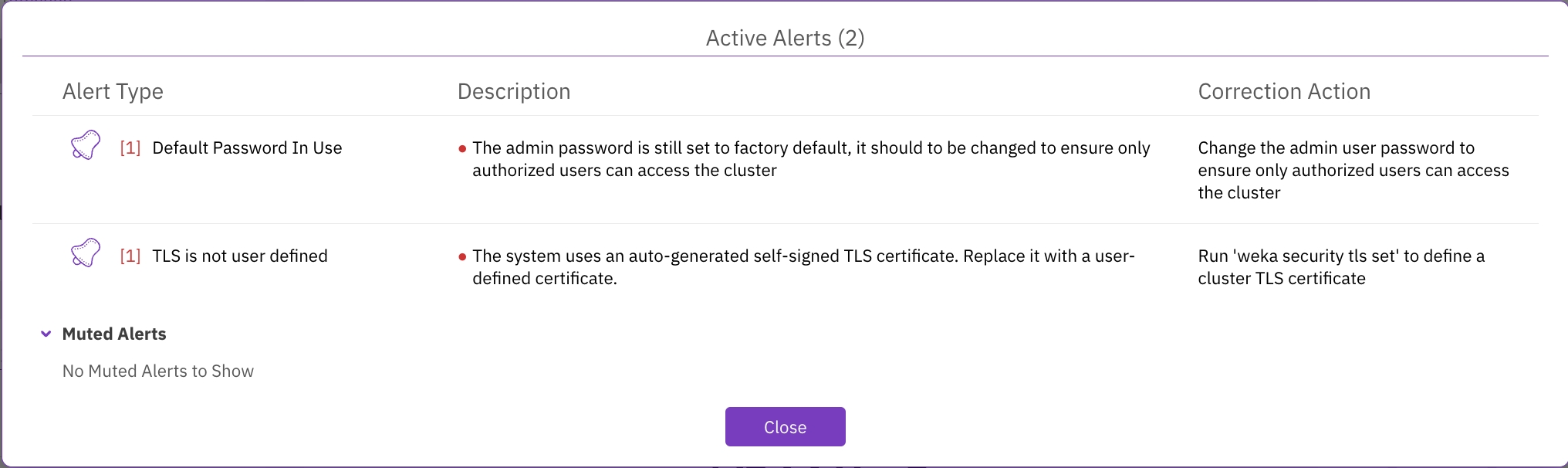 If for any reason, it is not possible to resolve the root cause of an alert in a reasonable time and you want to hide it temporarily, you can mute the alert for a specified period. Then later, you can unmute the alert and resolve it.