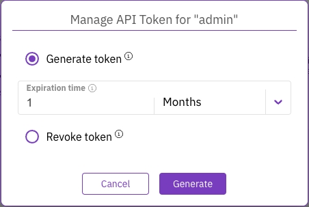 In the Manage API Token dialog, select Generate token and set the expiration time. Then, select Generate.