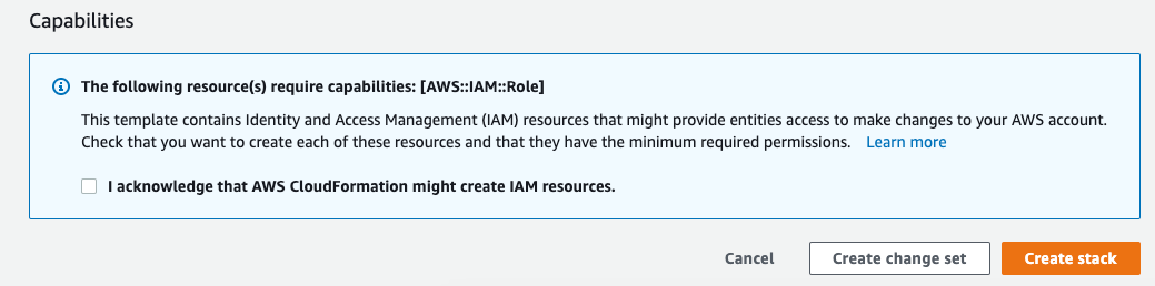 Once all required parameters have been filled, make sure to check the "I acknowledge that AWS CloudFormation might create IAM resources” checkbox at the bottom and click the Create Stack button: