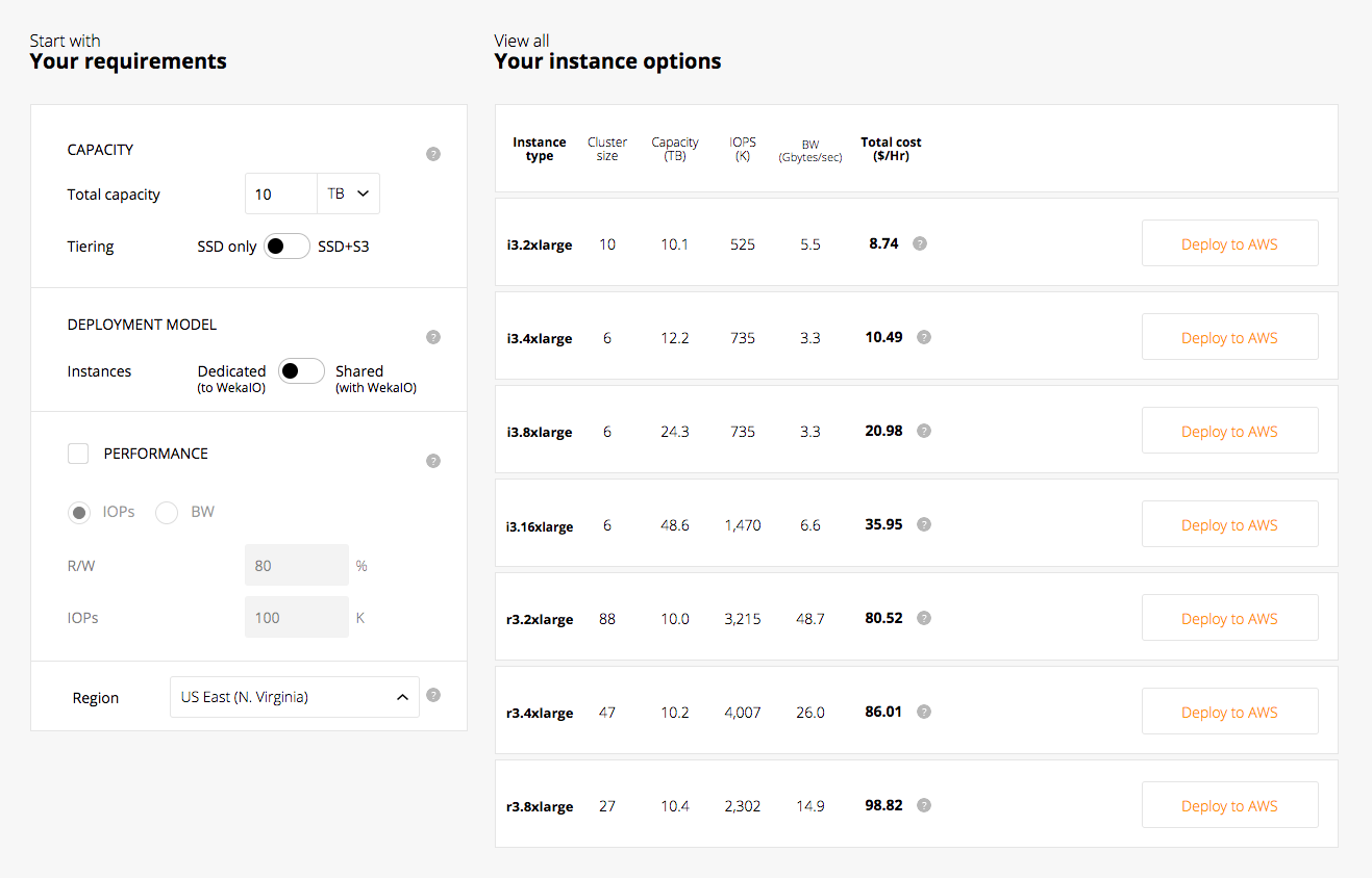 The Self-Service Portal is available at https://start.weka.io. Its main screen is divided into two panes: the left pane, which is used for input requirements, and the right pane which displays possible configurations for the defined requirements.