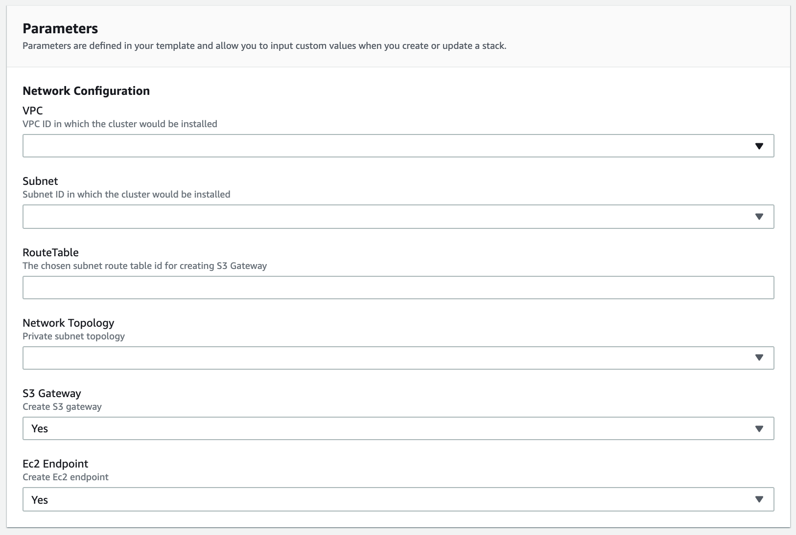 In the Create Stack screen, define the parameters which are specific to your AWS account.