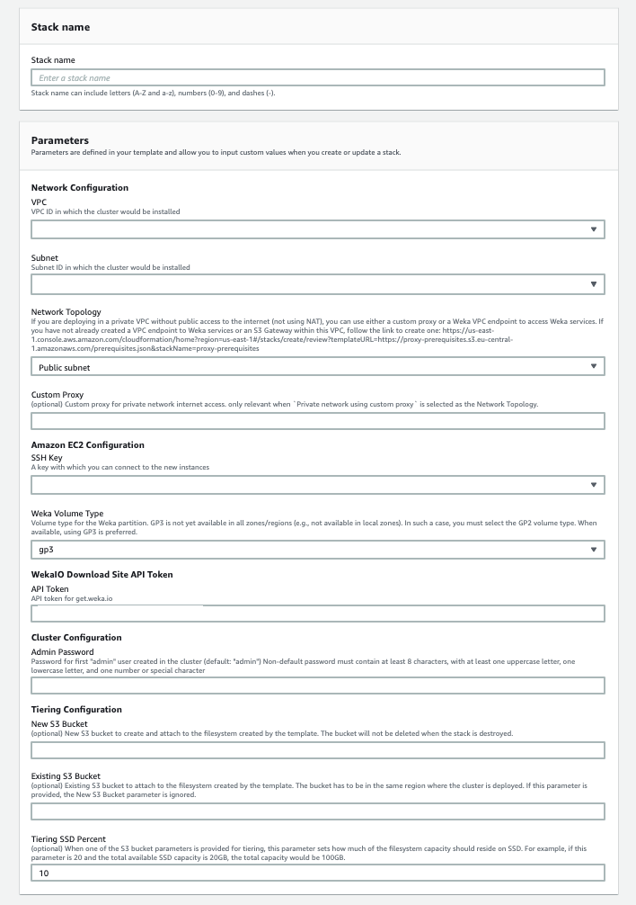 Public SubnetPrivate subnet with NAT internet routingPrivate subnet using Weka VPC endpoint- requires to create a CloudFormation stack (once per VPC) that creates the required resources.Private subnet using custom proxy- requires to create a CloudFormation stack (once per VPC) that creates the required resources.