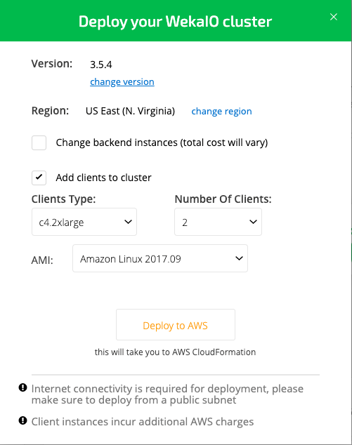Once the configuration to be deployed has been found, click the Deploy to AWS button next to the desired configuration. At this point, it is possible to specify additional options for the deployment, such as adding client instances or selecting the WEKA system version to be deployed.