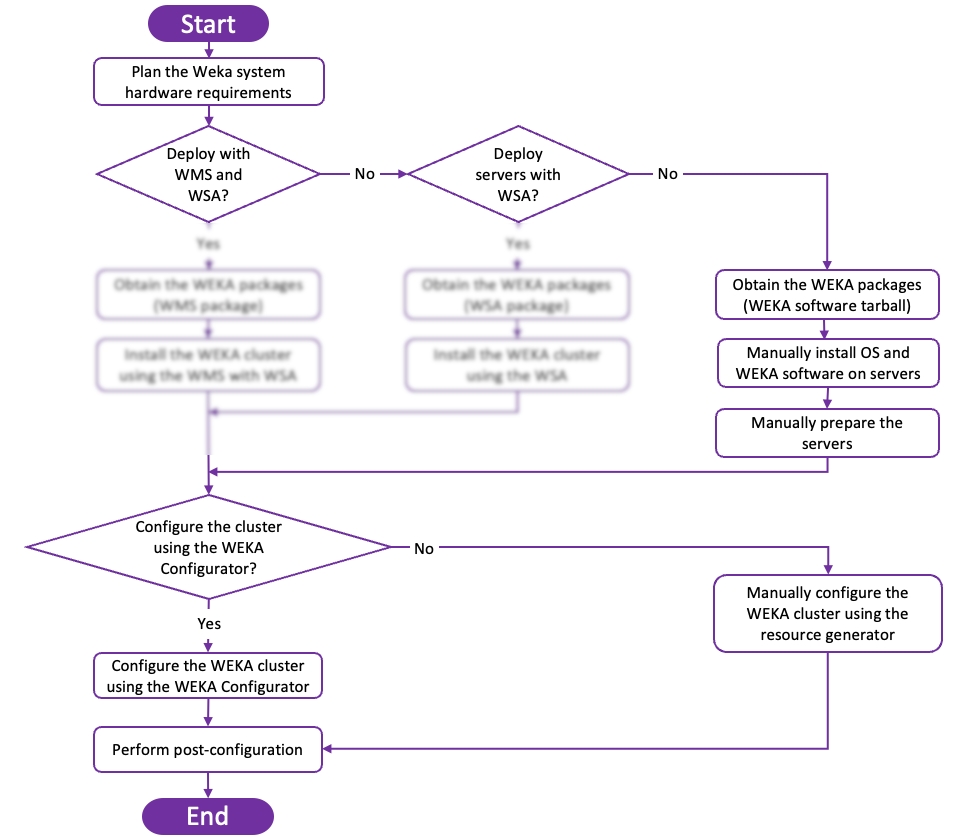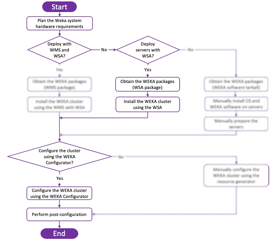 The following summarizes the three workflow paths to install and configure the WEKA cluster.
