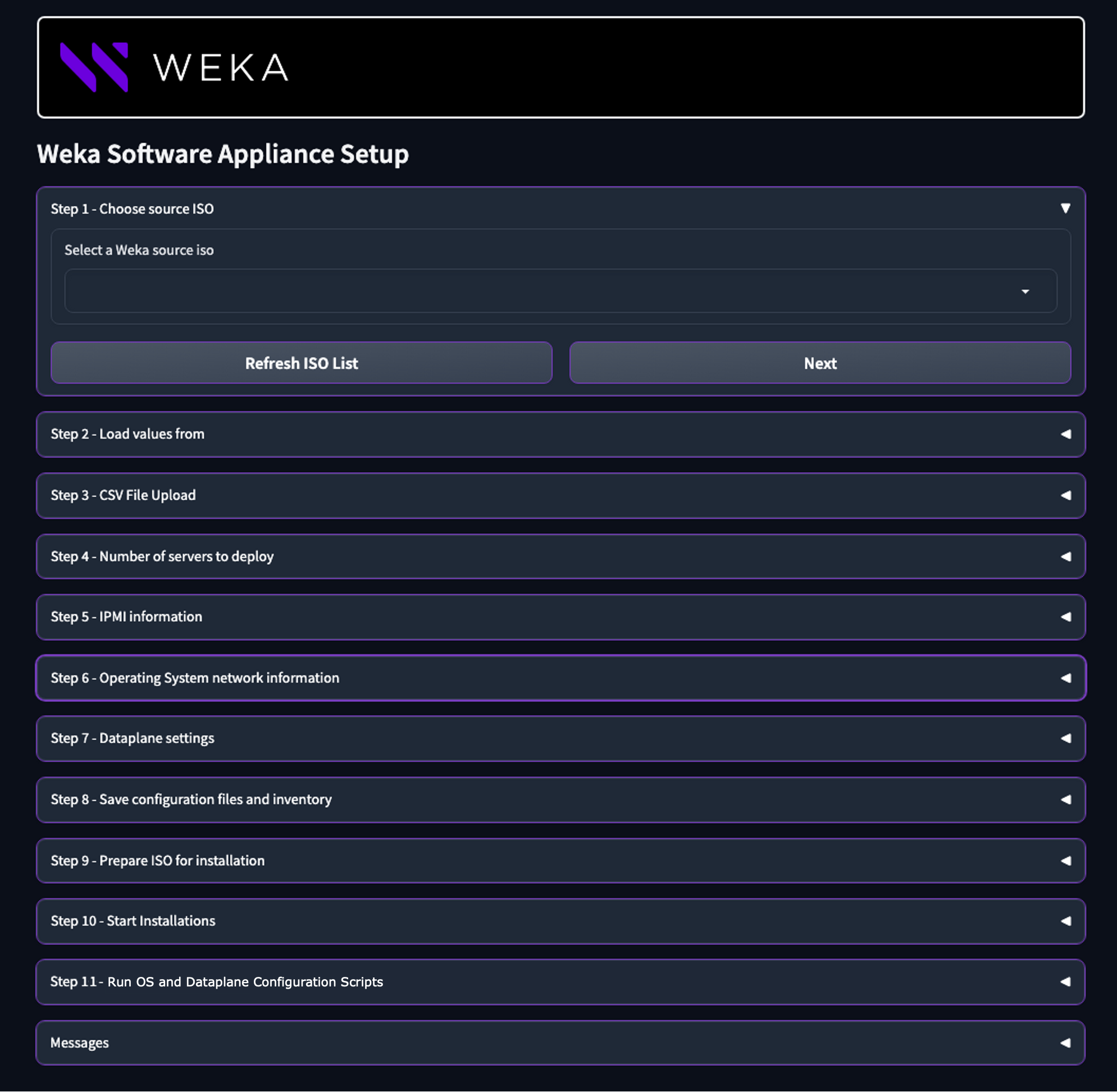 The WSA packages that appear in the list are taken from `/home/weka`. You can have more than one in the directory. If none are displayed, click **Refresh ISO List**. If none are displayed after that, copy a WSA package to `/home/weka` and click **Refresh ISO List** again. Once you select a WSA ISO, click **Next.**