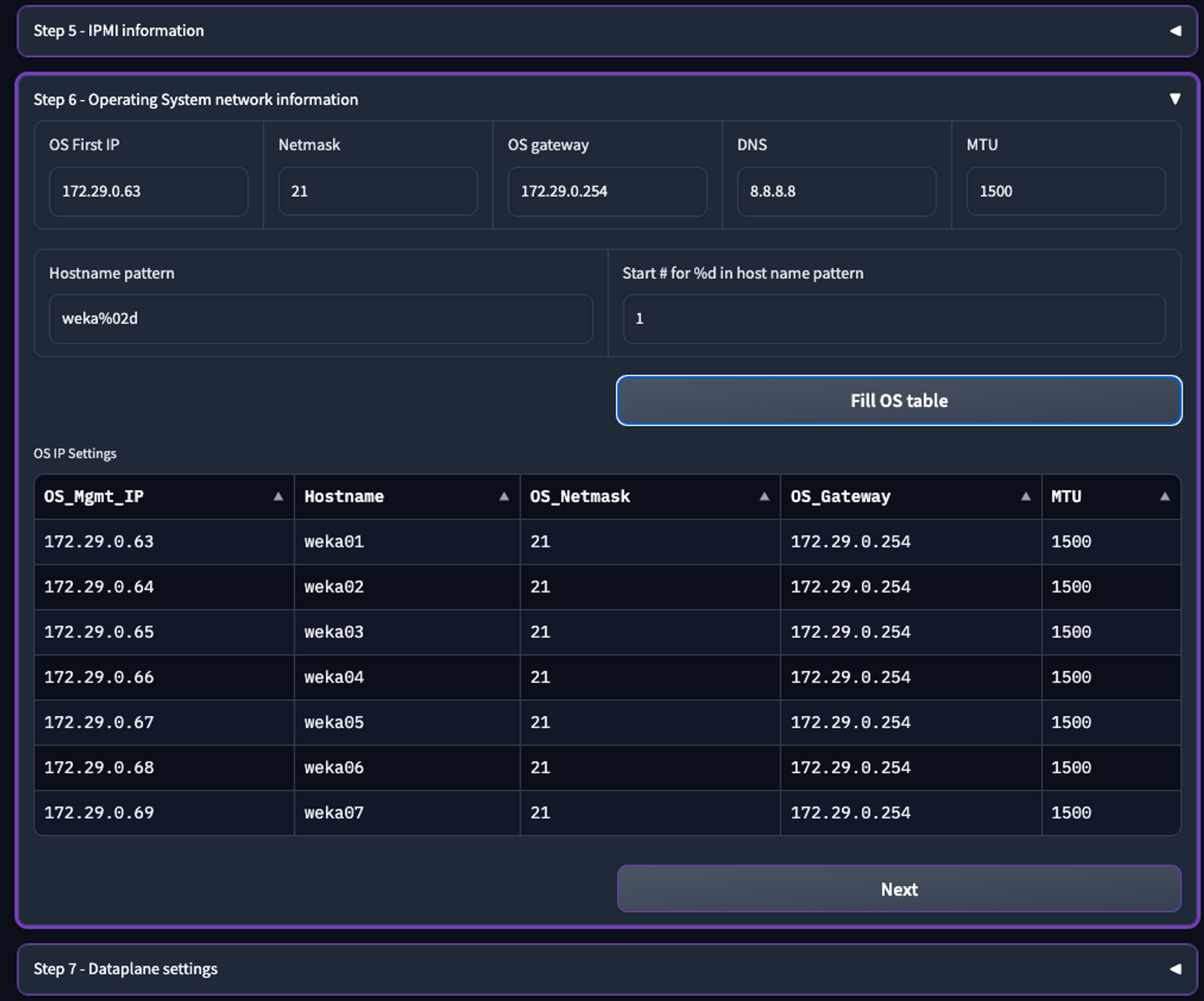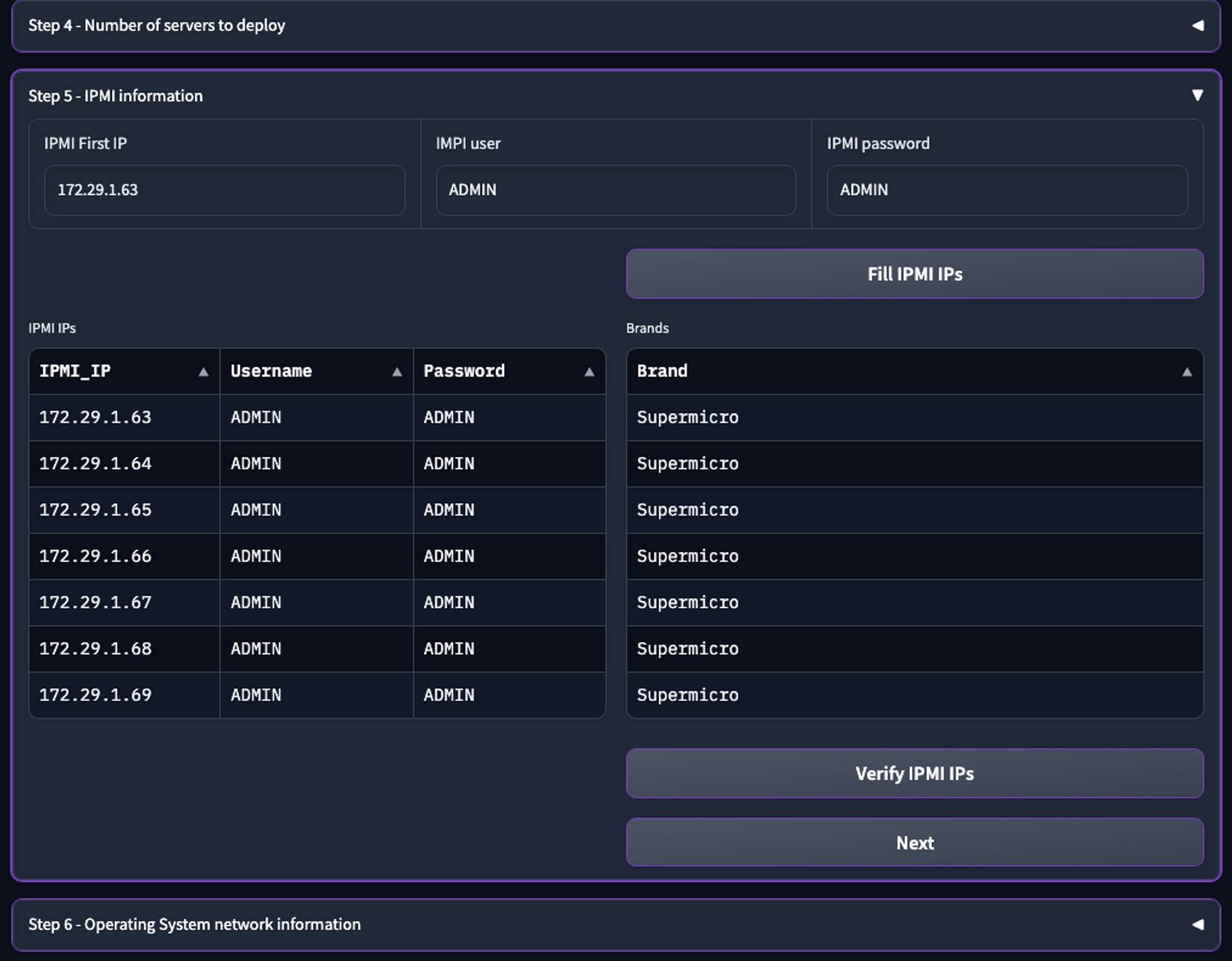 * Click **Fill IPMI IPs** to calculate the IP addresses for the number of servers specified in Step 4.