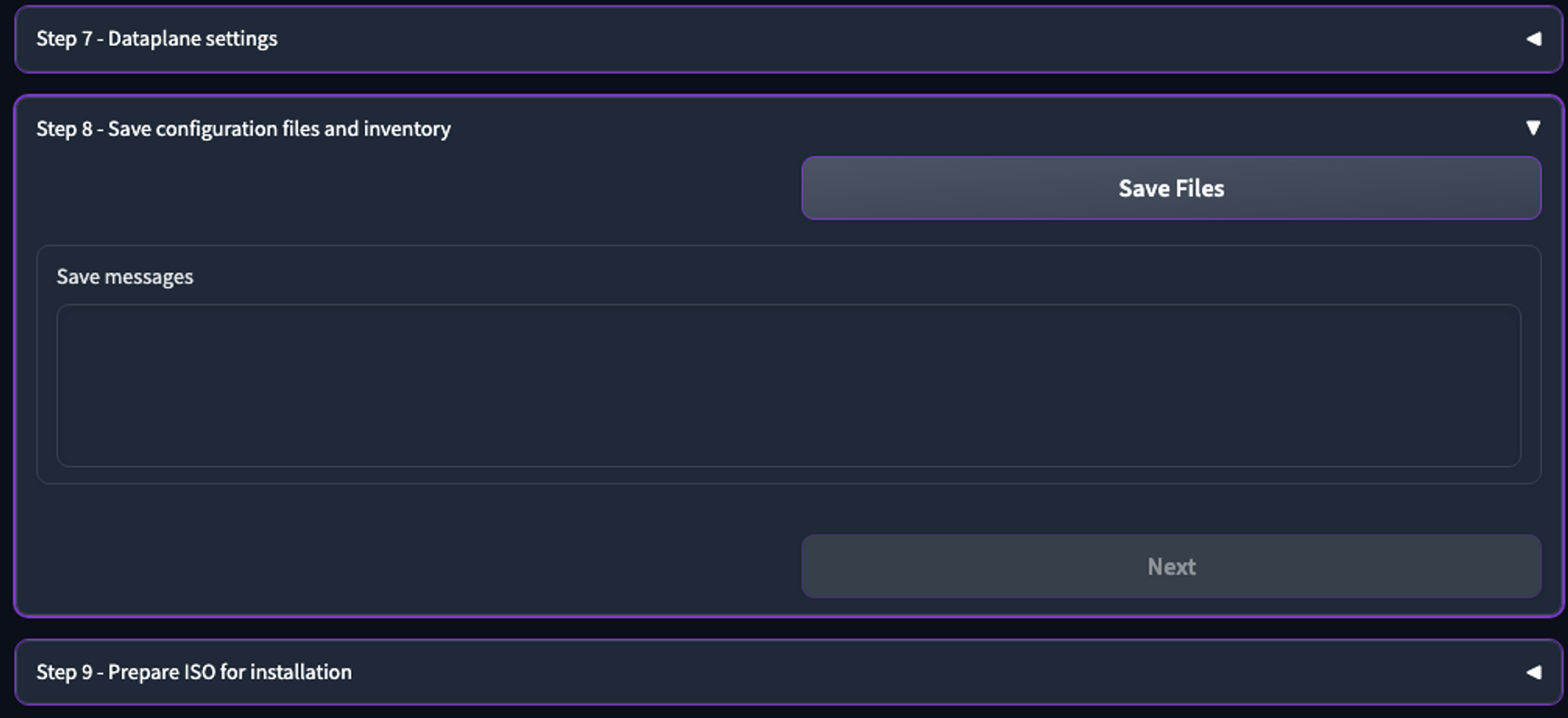 8. In **Step 8 - Save configuration files and inventory**, click **Save Files** to save the configuration files, and then click **Next**.