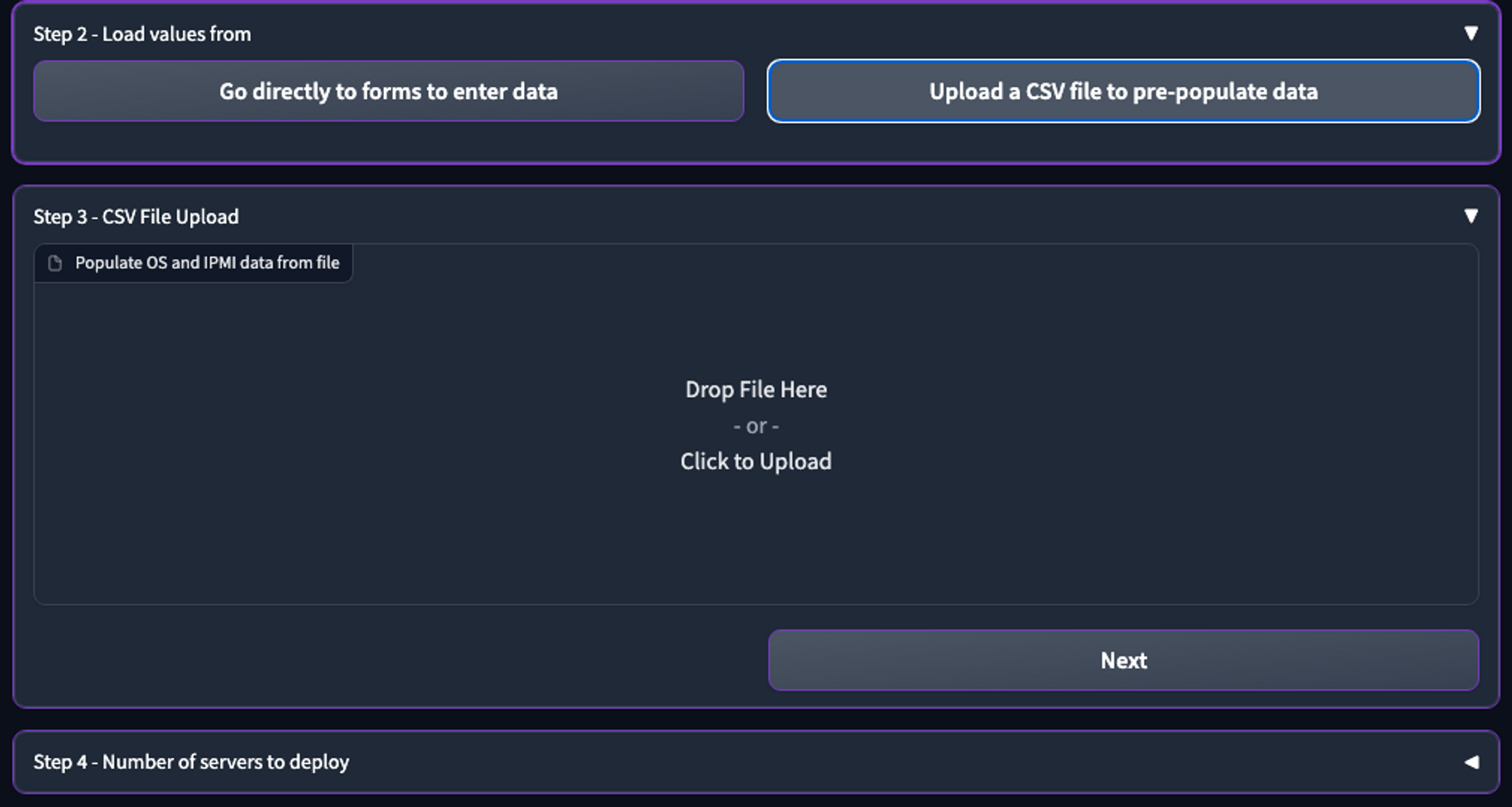 If you have the environment data in a CSV file, click **Upload a CSV file to pre-populate data**. Step 3 - CSV File Upload section opens.