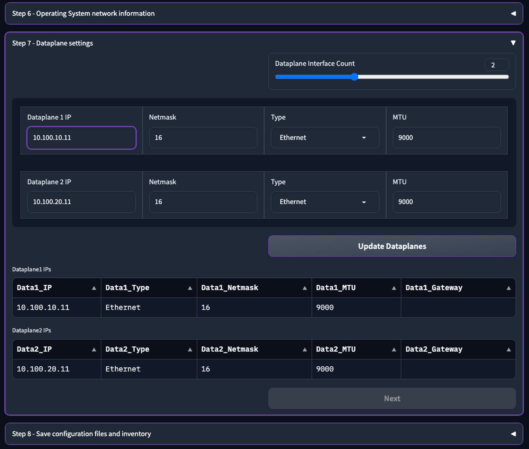 7. In **Step 7 - Dataplane settings**, do the following: