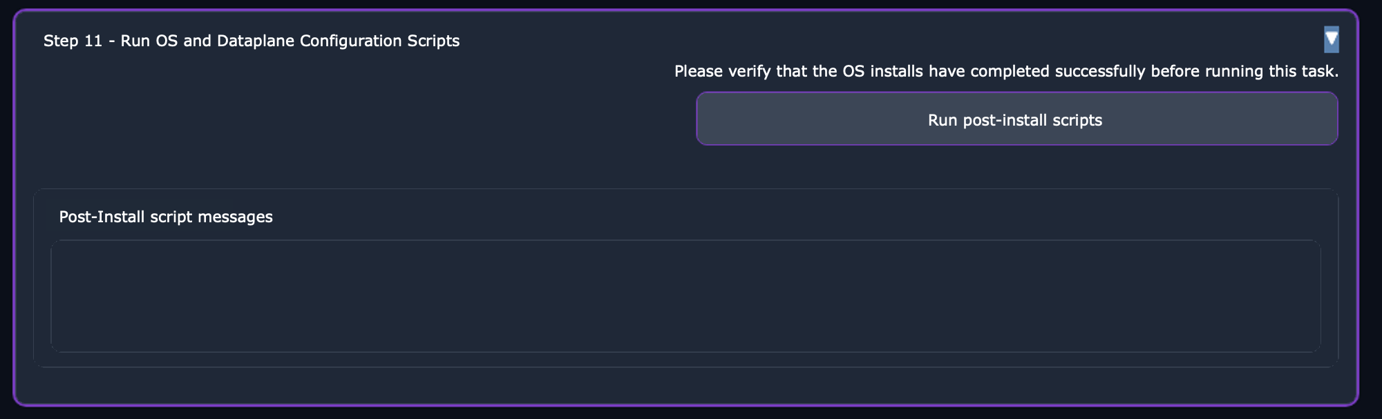 11. In **Step 11 -  Run OS and Dataplane Configuration Scripts**, click **Run post-install scripts**.  This action runs scripts to configure the servers with the specified dataplane IPs and perform additional tasks, such as populating `/etc/hosts`.