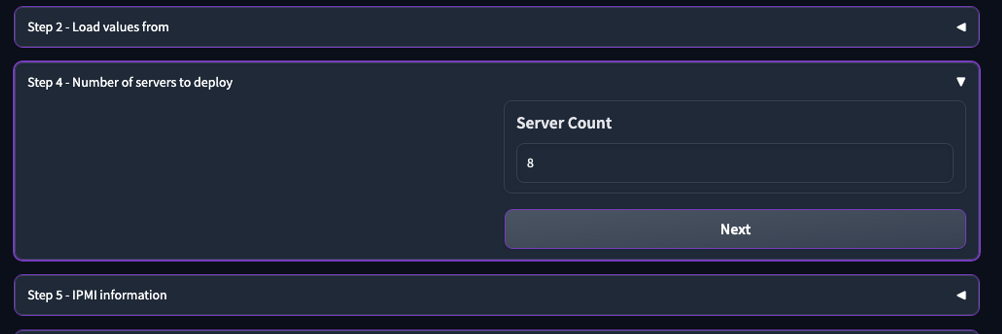 4. In **Step 4 - Number of servers to deploy**, enter a Server Count (default is 8), and click **Next**.