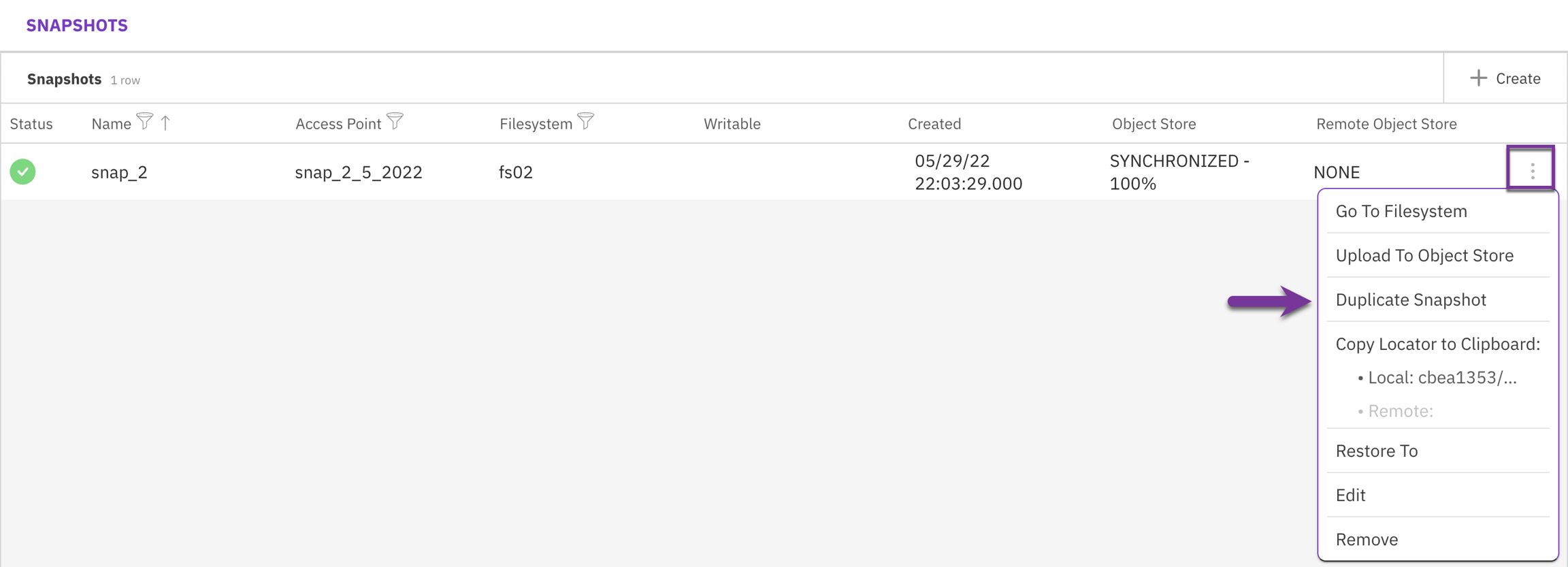 From the menu, select Manage > Filesystems. From the Filesystems page, select the three dots, and from the menu, select Create Snapshot (the source filesystem is automatically set).