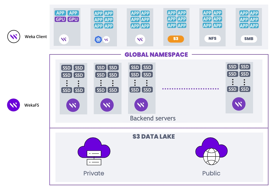 WekaFS stands out with its unique architecture, overcoming legacy systems’ scaling and file-sharing limitations. Supporting POSIX, NFS, SMB, S3, and GPUDirect Storage, it offers a rich enterprise feature set, including snapshots, clones, tiering, cloud-bursting, and more.