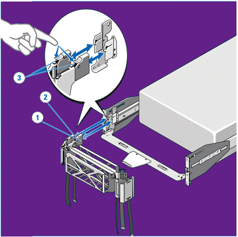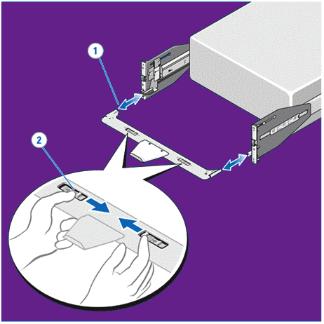 * **Install the tray:** Align and engage each side of the CMA tray with the receiver brackets on the inner edges of the rails. Push the tray forward until it clicks into place (1).