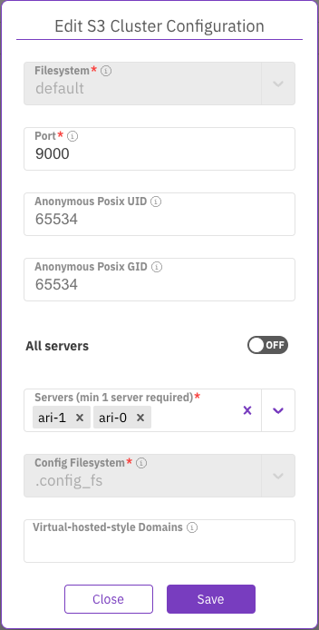 In the Config Filesystem, select the filesystem used for persisting S3 cluster-wide configuration.