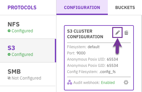 On the Configuration tab, select the pencil icon next to the S3 cluster configuration.