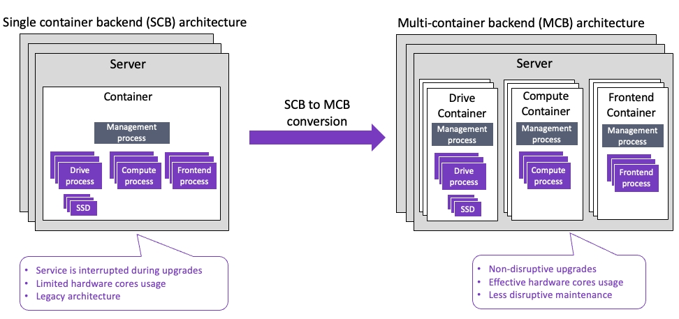 In SCB, the drive, compute, and frontend processes are in the same container. In MCB, a server includes multiple containers, each running a specific process type. The MCB offers benefits such as: