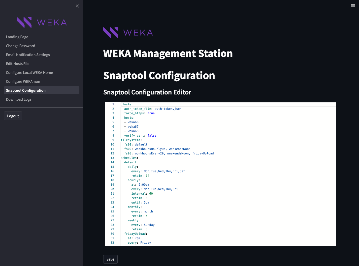 Snaptool shares the same cluster login information as WEKAmon and automatically detects and re-loads its configuration when any changes are made.