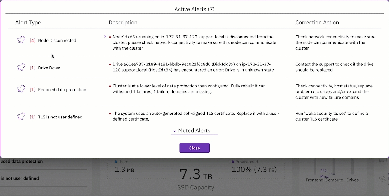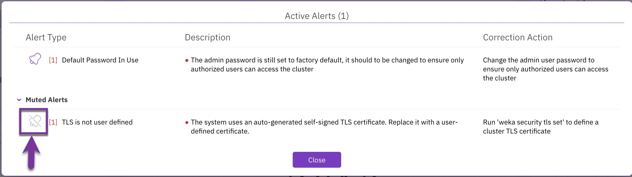 If for any reason, it is not possible to resolve the root cause of an alert in a reasonable time and you want to hide it temporarily, you can mute the alert for a specified period. Then later, you can unmute the alert and resolve it.