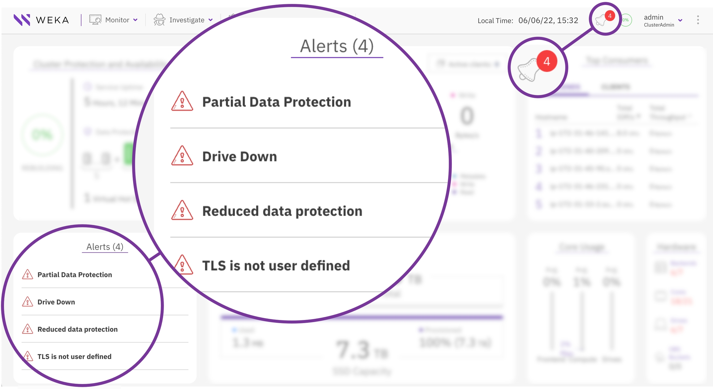 The bell icon on the top bar indicates the number of existing active alerts in the system. The alerts pane in the system dashboard also provides the name of the alerts.