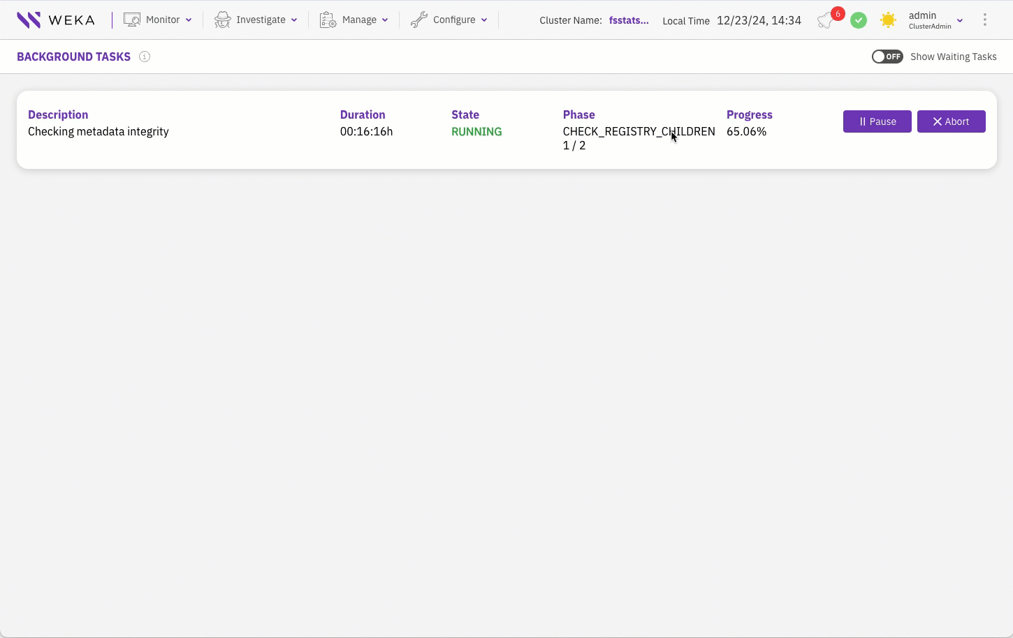 The Abort action is available for specific tasks, such as checking metadata integrity. However, it is not applicable to tasks like downloading a filesystem or snapshot, squashing a filesystem, or detaching object storage. To terminate these tasks, delete the associated entity.