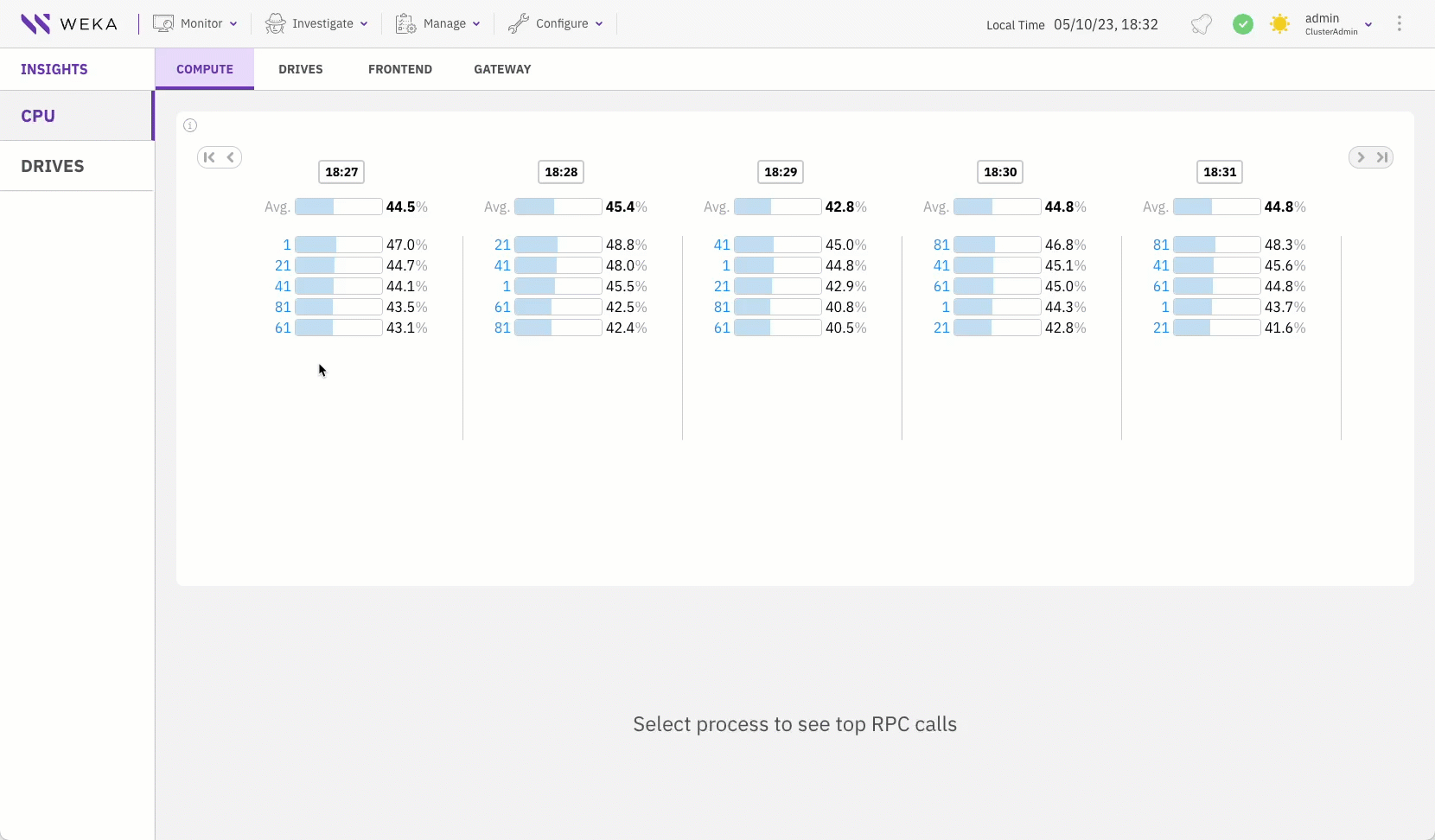 CPU insight provides a quick usage overview of the Compute, Drives, and Frontend processes, which run on stateless clients or backends as a gateway.