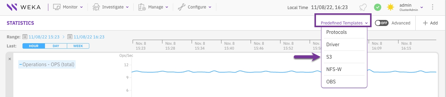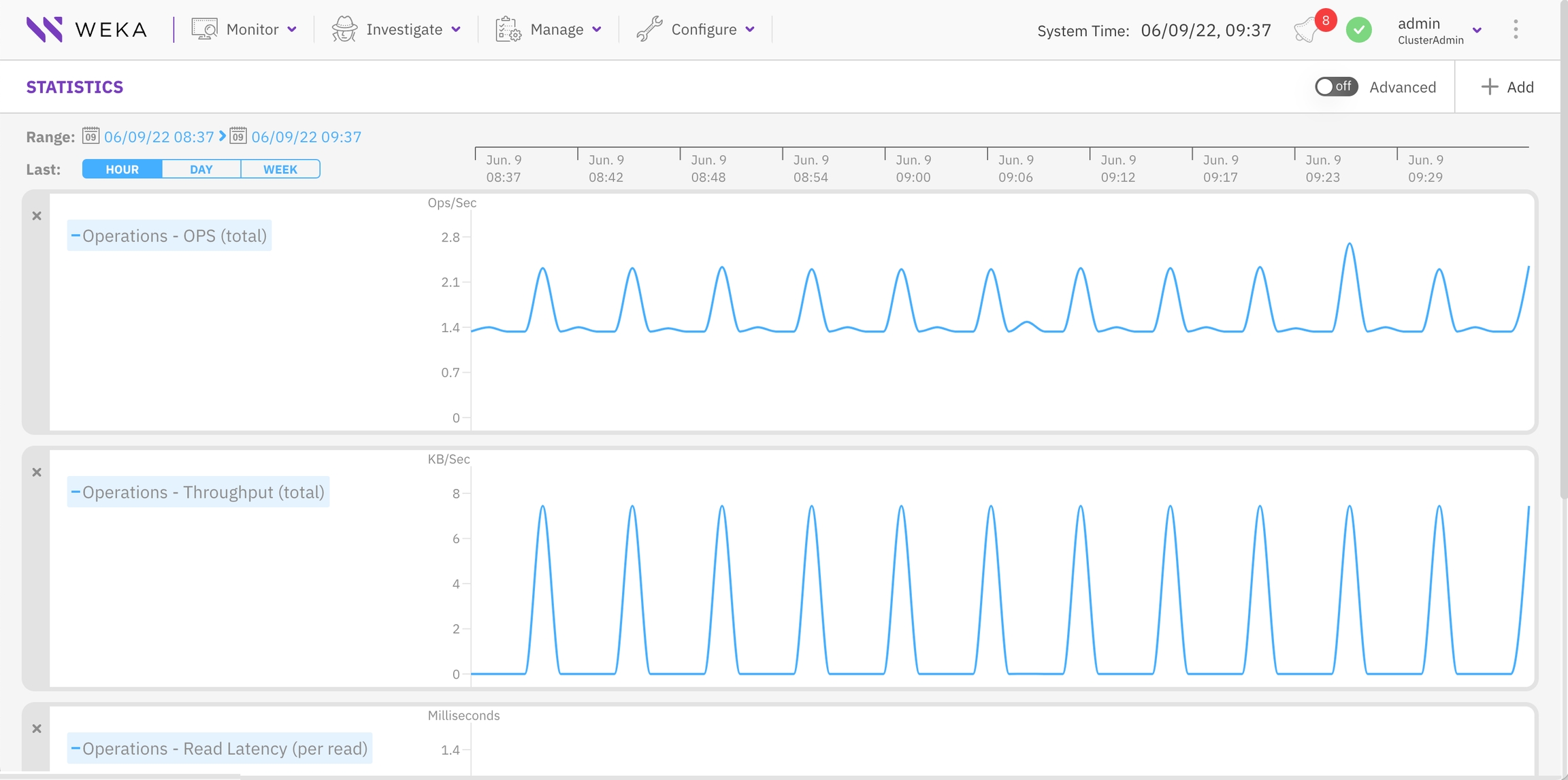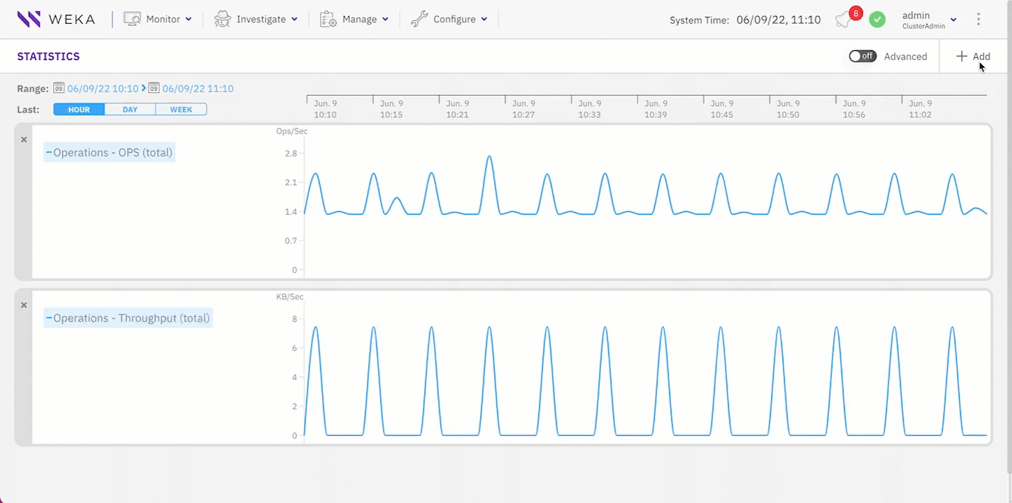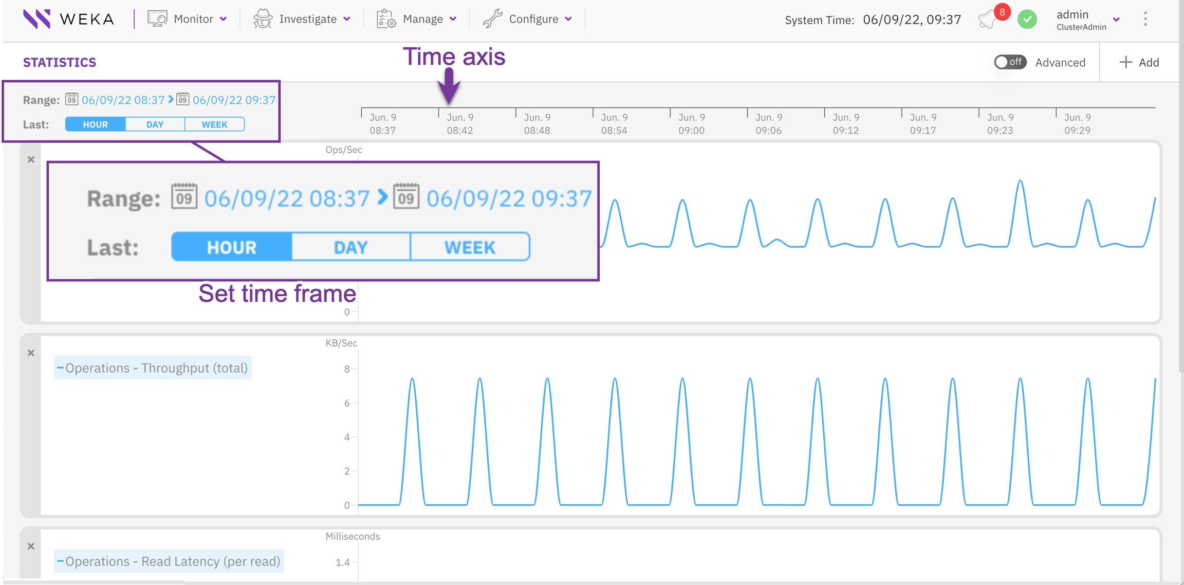 The Statistics page contains a time axis for all the displayed charts. To investigate charts in a specific timeframe, you can set the interval in the time axis to the last hour, last day, or last week. You can also set a timeframe for a specific period (start and end time).