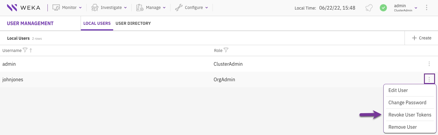 In the Local Users tab, select the three dots of the local user you want to revoke the user tokens, then select Revoke User Tokens.