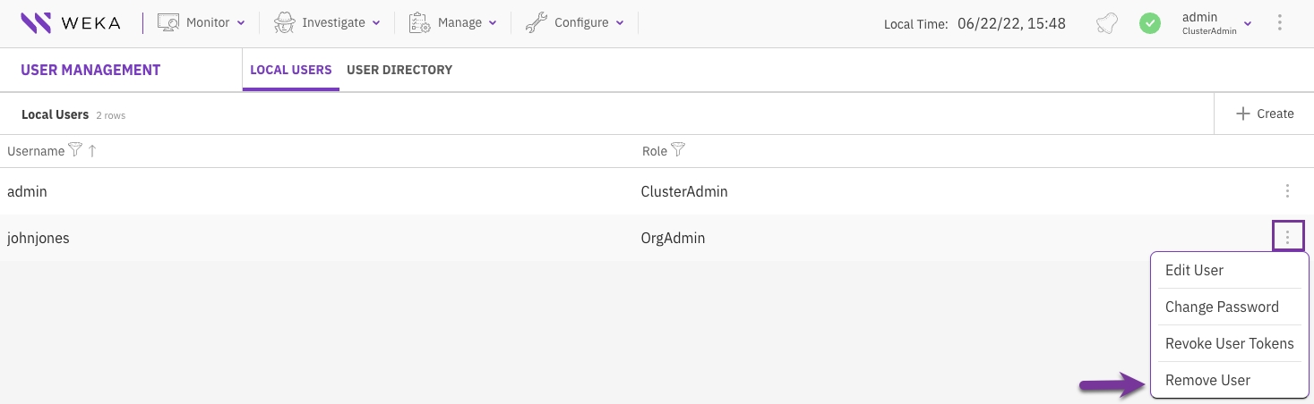 Local users are created in the local system instead of domain users that the organization's User Directory manages. You can create up to 1152 local users to work with a WEKA system cluster.
