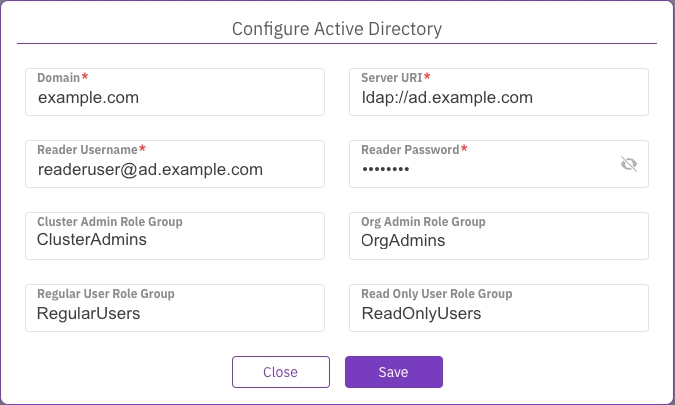 In the Configure Active Directory dialog, set the properties according to your AD environment. For details about each property, see the Active Directory property reference.