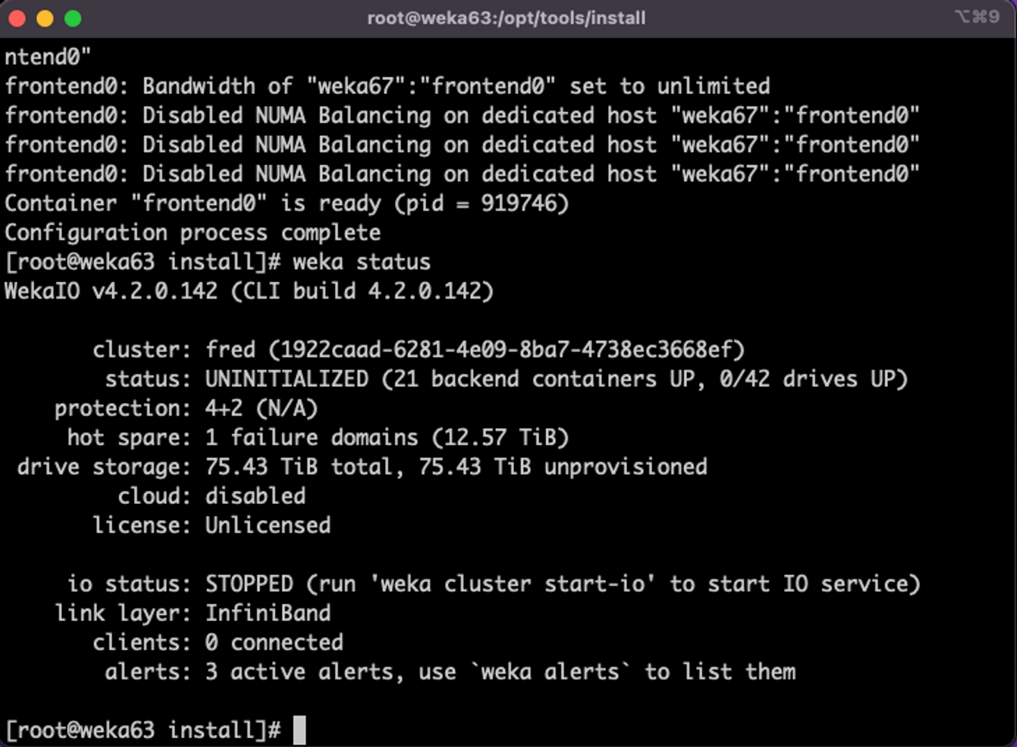 The configuration takes a few minutes and possibly longer for large clusters. See some examples of the configuration process and WEKA status.