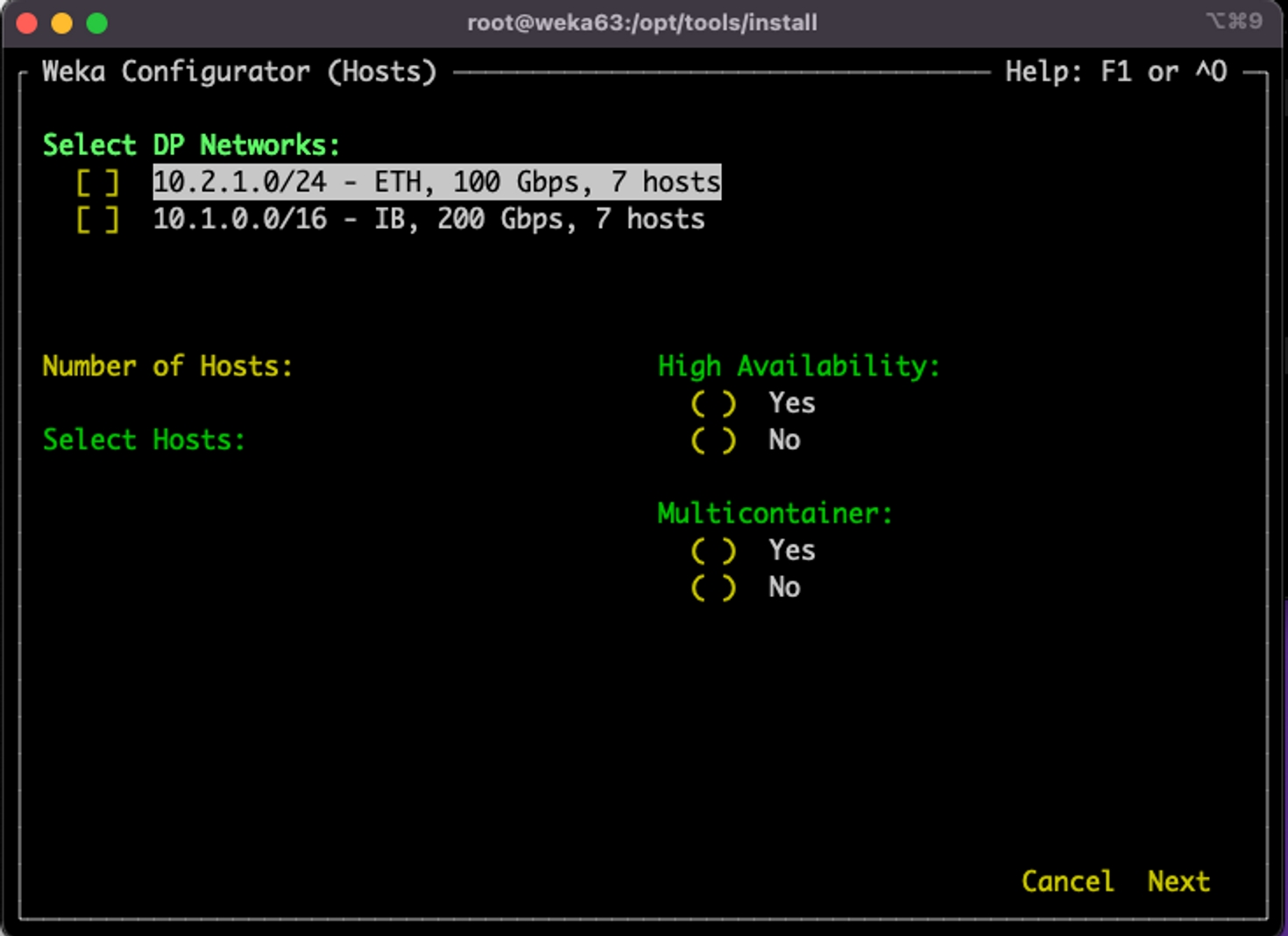 The wekaconfig displays the data plane networks (DP Networks) detected previously. The list under Select DP Networks reflects the high-speed (100Gb+) networks used for the WEKA storage traffic.