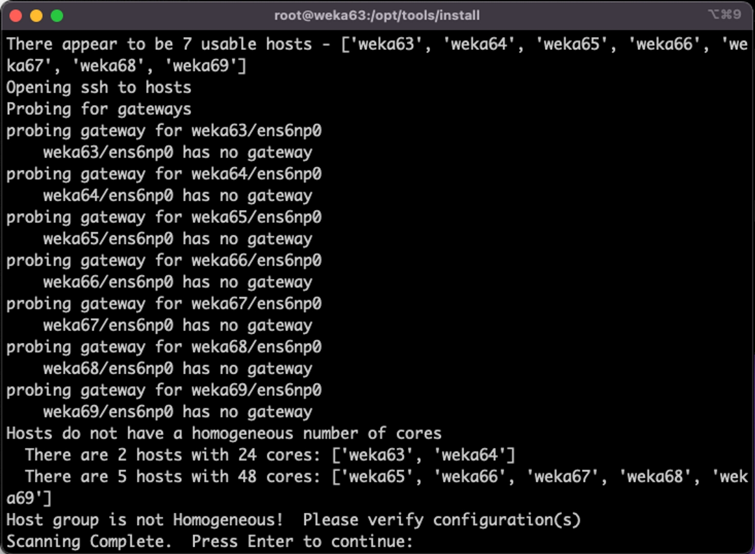 The wekaconfig tool scans the environment, detects the servers, and evaluates whether the group of servers is homogeneous. The following example demonstrates a scenario where the servers do not have a homogeneous number of CPU cores.
