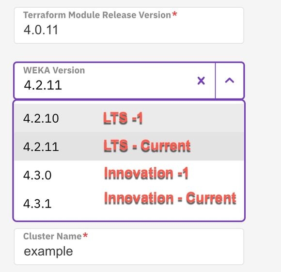 Certain fields within the configuration input panel require manual user input. Other fields, such as Instance Type, WEKA Version, and Region, are provided as selectable dropdown menus.