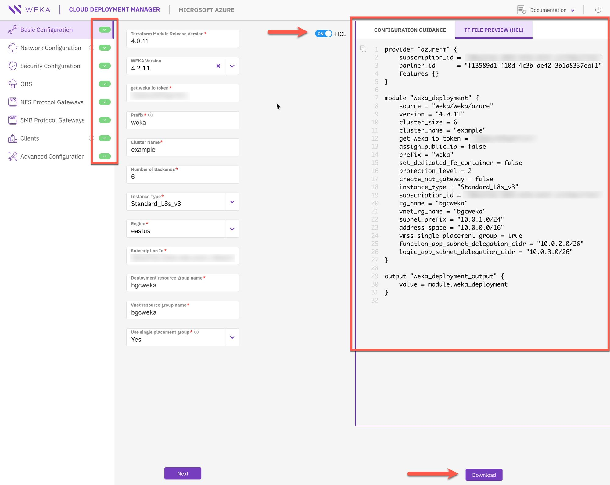 * **Functionality:** A **Download** button allows you to save the file locally, manually execute the relevant Terraform `plan`, and `apply` commands for WEKA cluster deployment.